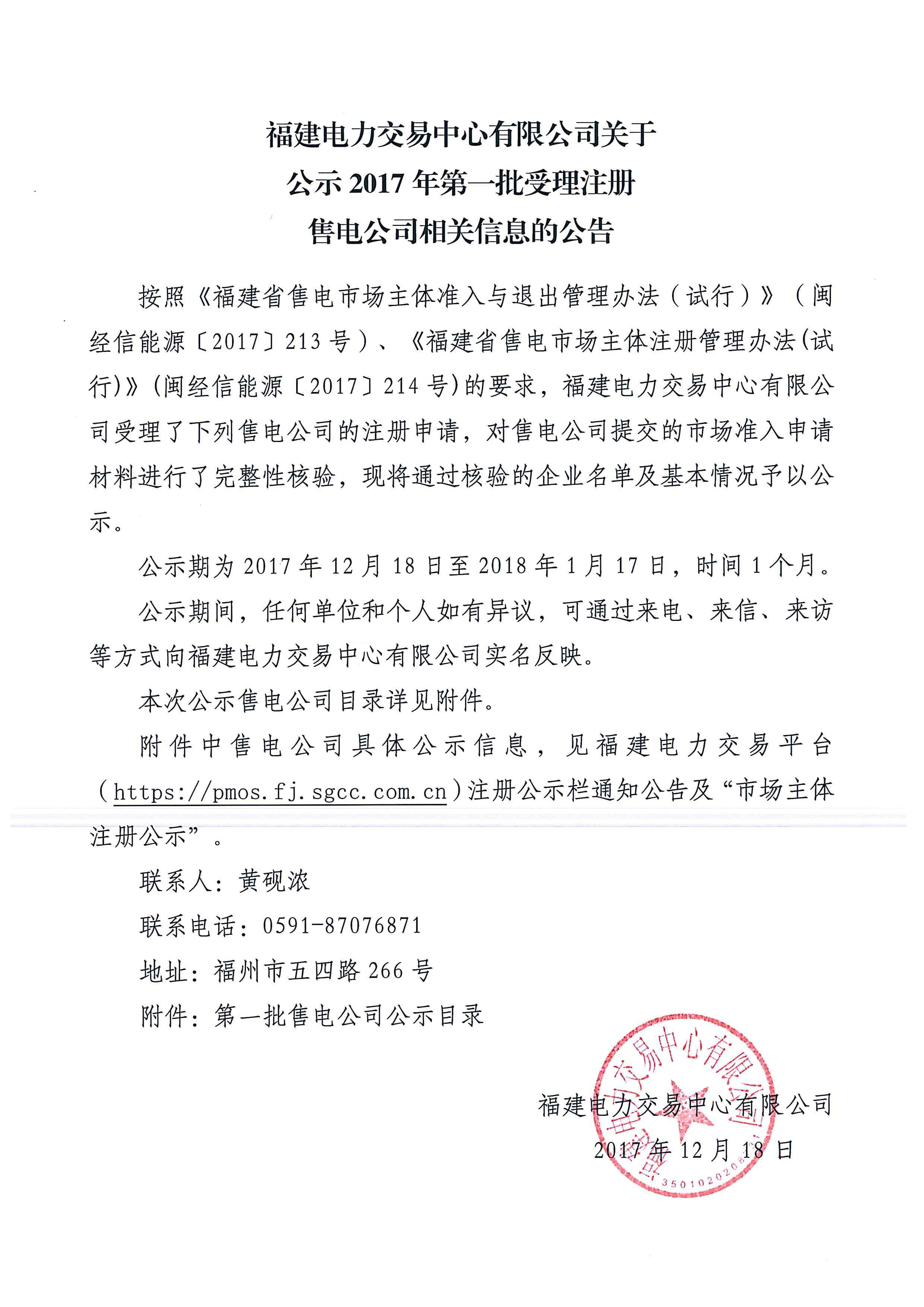 福建电力交易中心有限公司关于公示2017年第一批受理注册售电公司相关信息的公告